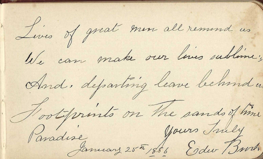 Even the estimable patriarch, Mr. Edward Brooks, who offered words of wisdom for us all, offered his signature. Victorian adults did feel they should never miss a chance to offer proper guidance to the younger generation. But you know, Mr. Brooks’ words sound pretty wise still.