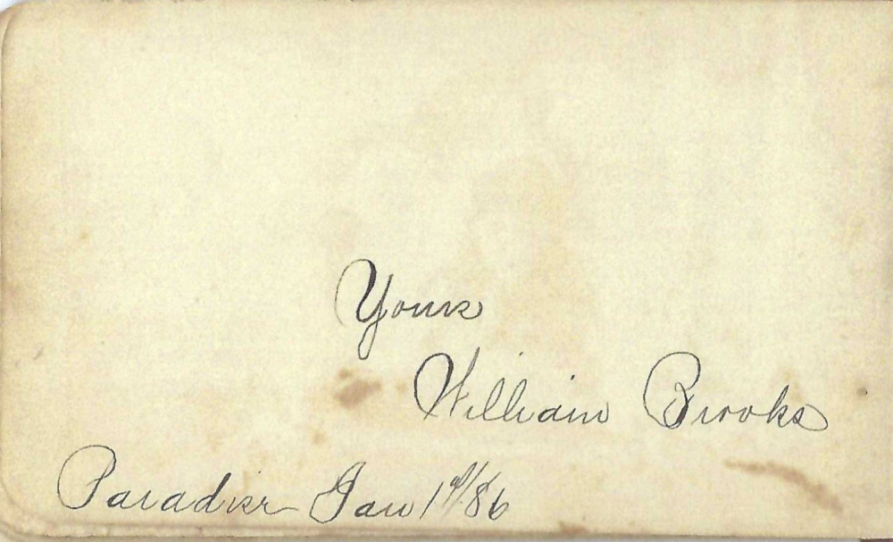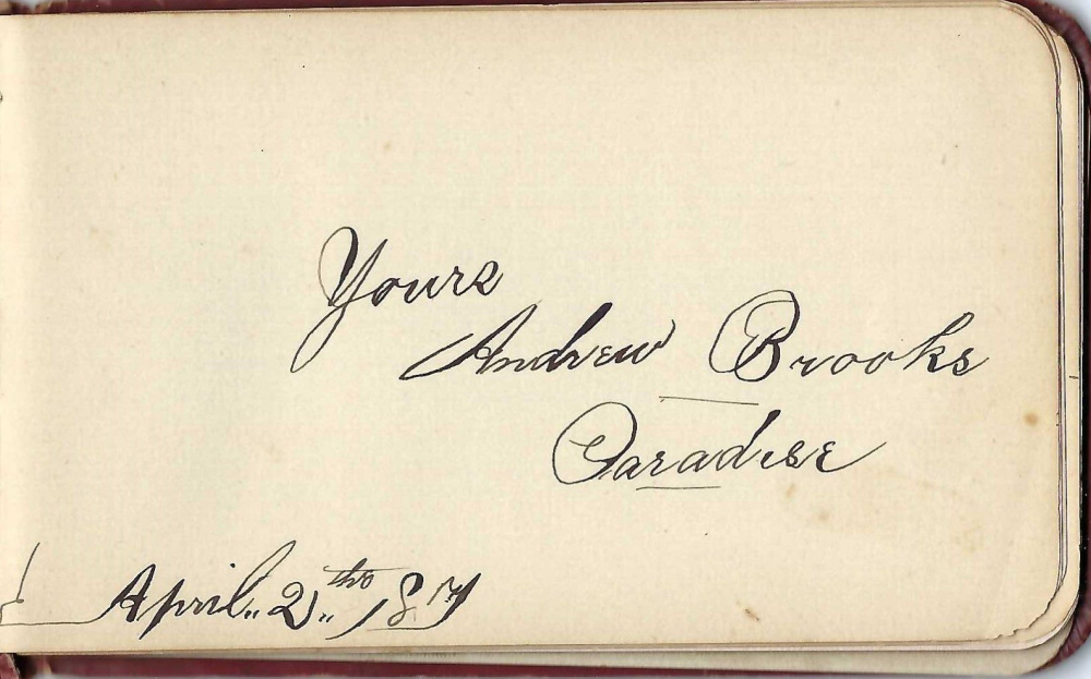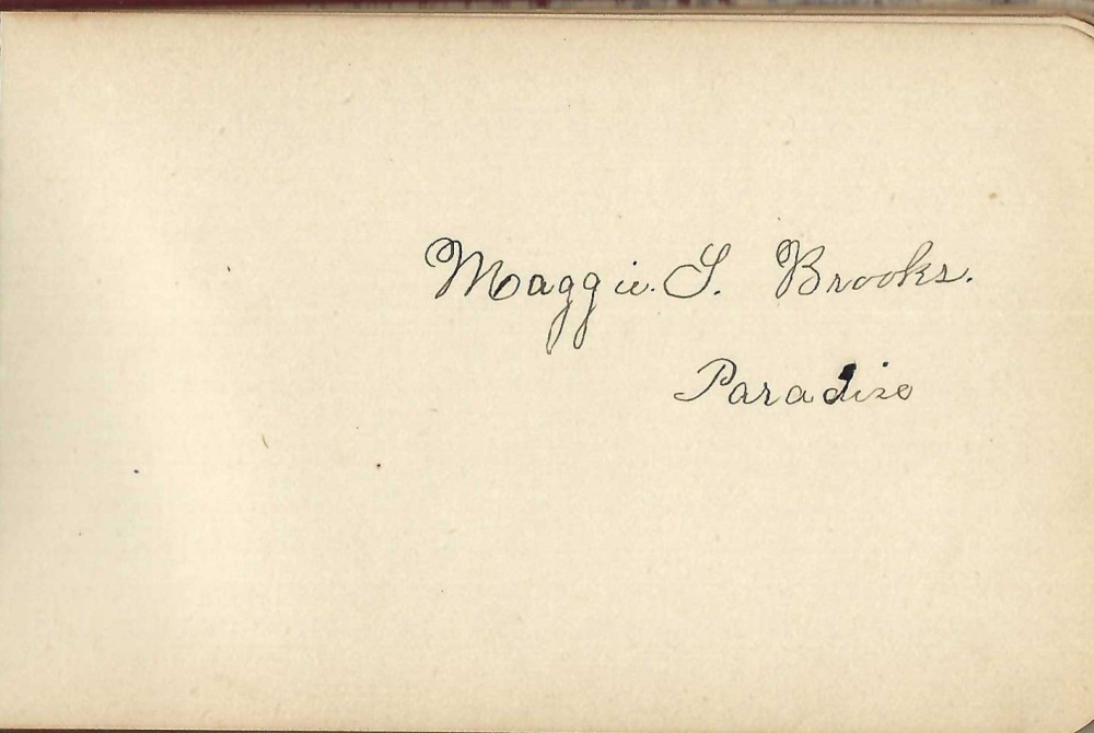 As for Mack, he would not live to see Brooks’ Store, nor would his friend Maggie. In 1887, the three families on the Paradise corner were close. Among the Brooks children, Maggie was closest in age to Mack, and may have signed his autograph book early with Harry and Bessie Starratt and William Brooks. Andrew signed it later.