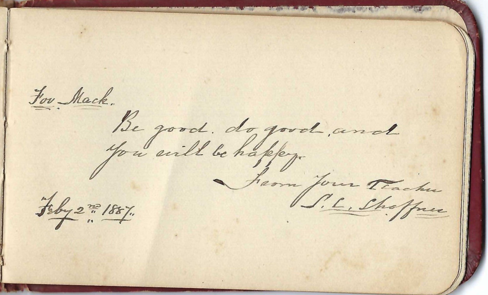 To young Mack Bent, Mr. Shaffner, in the careful cursive inking of the day, gave the best advice he knew: do good and be good and that will make you happy. We hope he was.