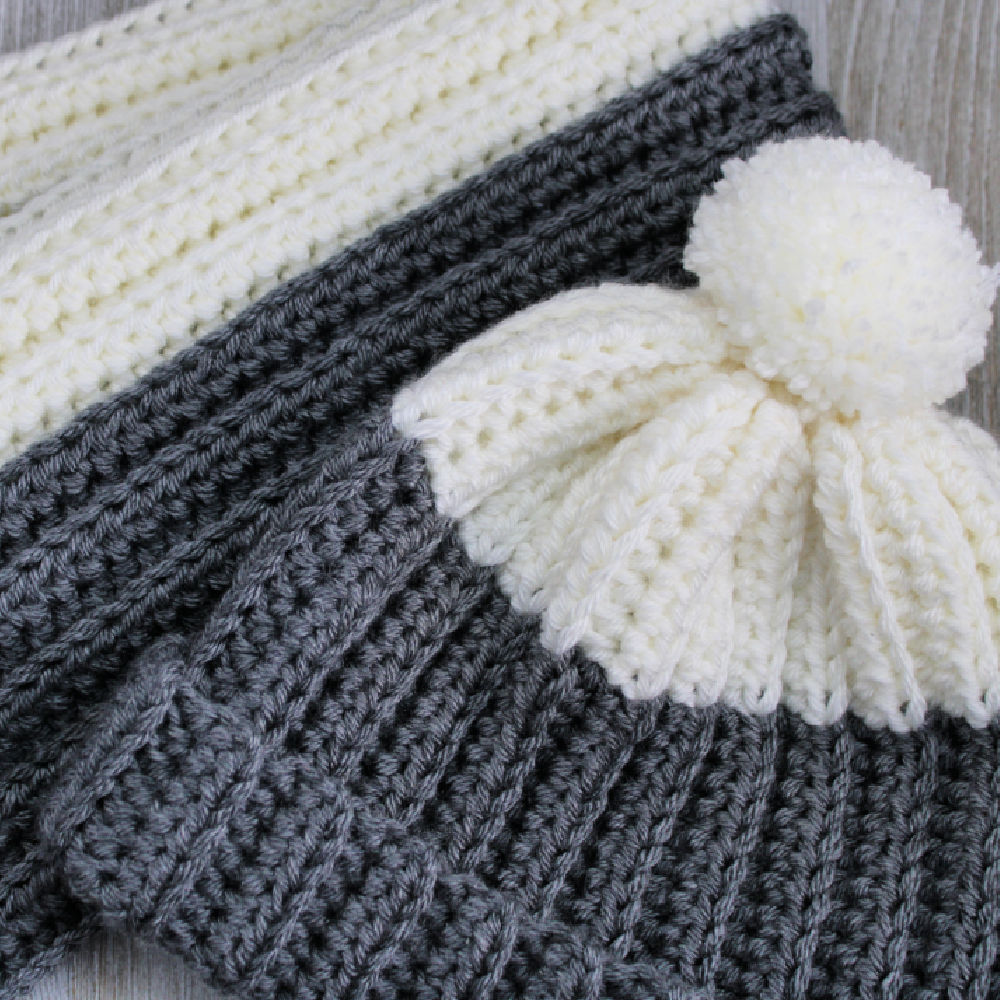 Handmade; crocheted grey and off-white hat and scarf set