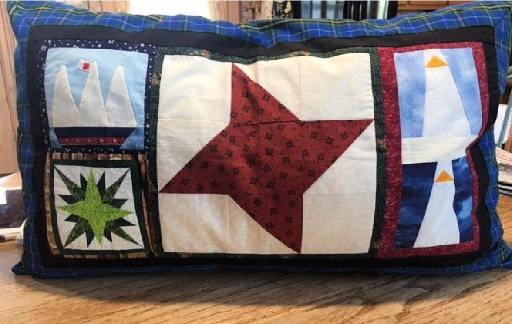 Handmade Throw pillow; size ~ 15″x25″; Border is Nova Scotia tartan; back opening allows for pillow replacement