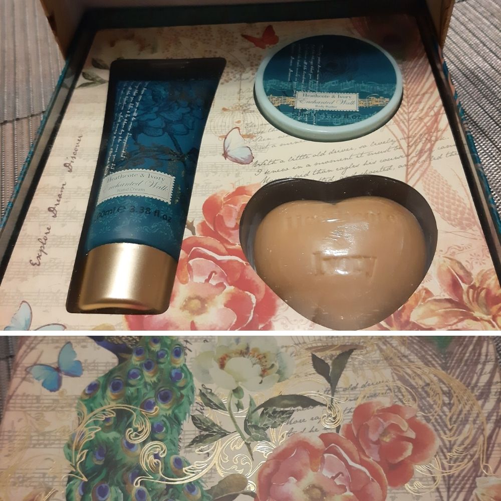 Heathcote & Ivory “Enchanted Walk” Hand and Body treats; includes 100 ml hand cream, 50 ml body butter, and 80 g soap