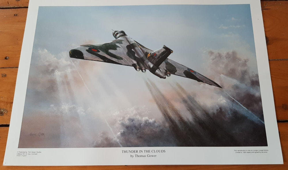 Limited edition print of a Vulcan Bomber (number 1289/1500); Signed by English aviation artist, Tom Gower; measures 18″x 12.5″