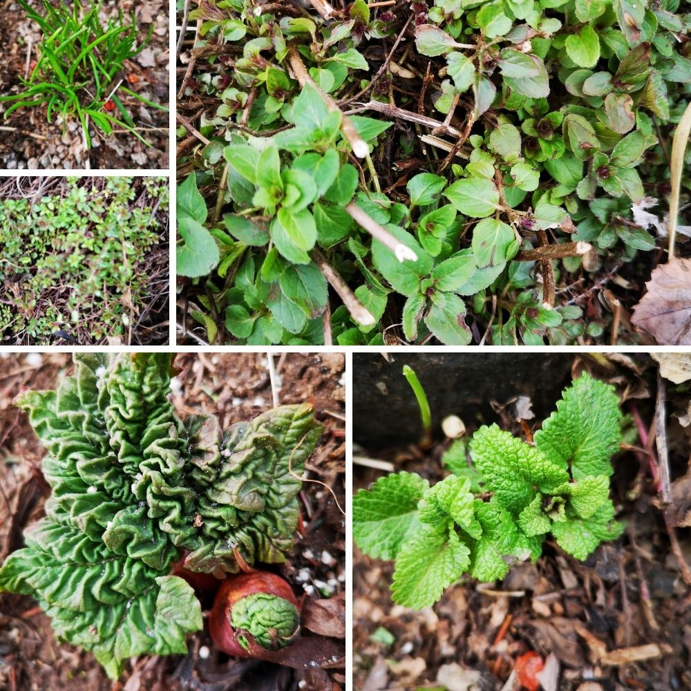 Includes oregano, mint (not shown), chives, lemon balm, rhubarb, and creeping thyme.